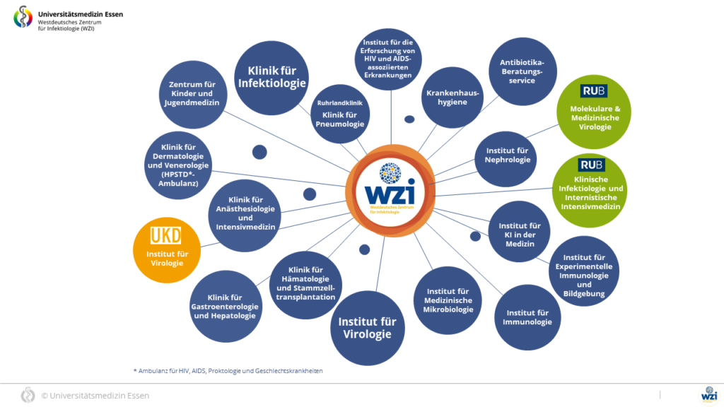 Am WZI arbeiten Teams aus 16 verschiedenen Kliniken und Instituten der Universitätsmedizin Essen, einem Institut und einer Klinik der Ruhr-Universität Bochum, sowie ein Institut des Universitätsklinikum Düsseldorf interdisziplinär zusammen. So finden regelmäßig interdisziplinäre Krankenbesprechungen statt, in welchen die Therapie jedes einzelnen Patienten ausführlich und unter Berücksichtigung der verschiedenen fachärztlichen Perspektiven besprochen wird. Darüber hinaus werden generelle Behandlungsempfehlungen und Standardprozeduren entwickelt. Im Rahmen von Forschungskooperationen wird außerdem gemeinsam an der Entstehung von Infektionskrankheiten geforscht.